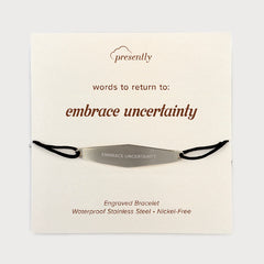 At the center is your chosen Presently phrase—engraved as a daily reminder to return to the present moment, even when your thoughts pull you elsewhere.